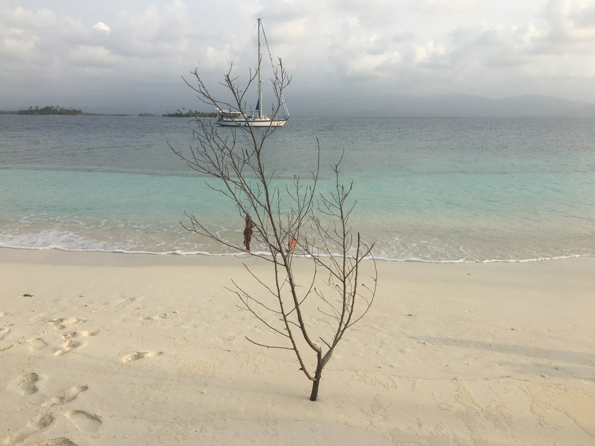 Estábamos en nuestra isla, a la que renombramos «Mágica», conocida ahora por los Gunas como la isla de los españoles. Isla preciosa de 1km. de perímetro, deshabitada y rodeada de playa. Allí nos atrincheramos los 6 barcos amigos: Saramia, Mola Mola, para los amigos el Molí, Malevaje, Biguà, ( brasileños) y Tsabalok, (Panameños). En total 12 adultos, 1 adolescente y 5 niños y una Perra pastor del Norte.
